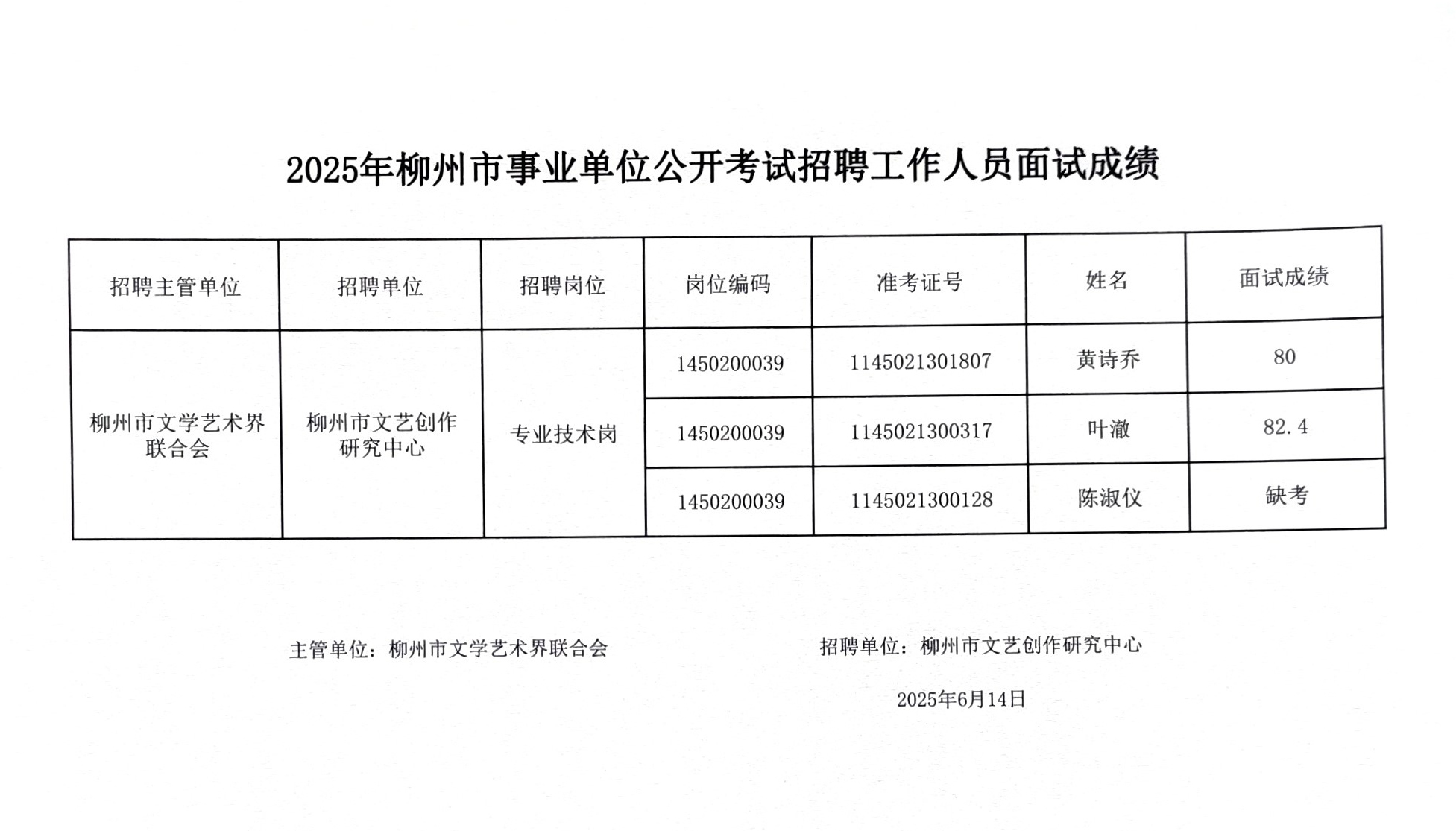 2025年柳州市事业单位公开考试招聘工作人员面试成绩