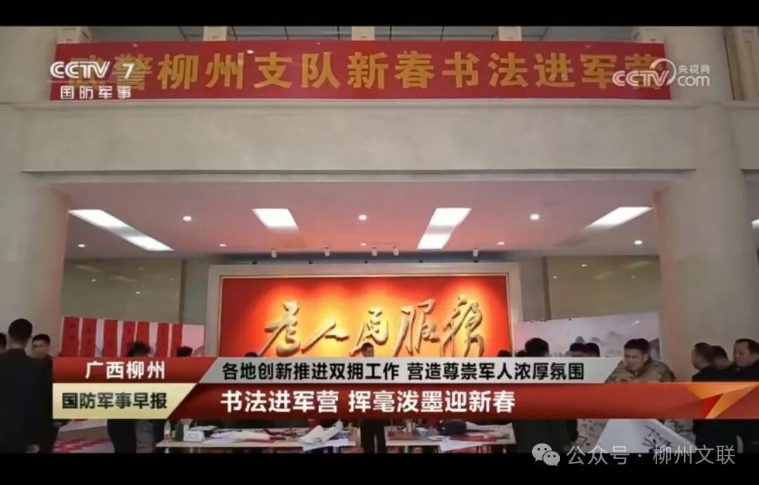 1月30日,中央广播电视总台CCTV7国防军事早报《各地创新推进双拥工作 营造尊崇军人浓厚氛围》栏目播出“广西柳州 书法进军营 挥毫泼墨迎新春”,报道柳州文艺工作者走进武警部队营区,为官兵赠春联写“福”字送祝福。