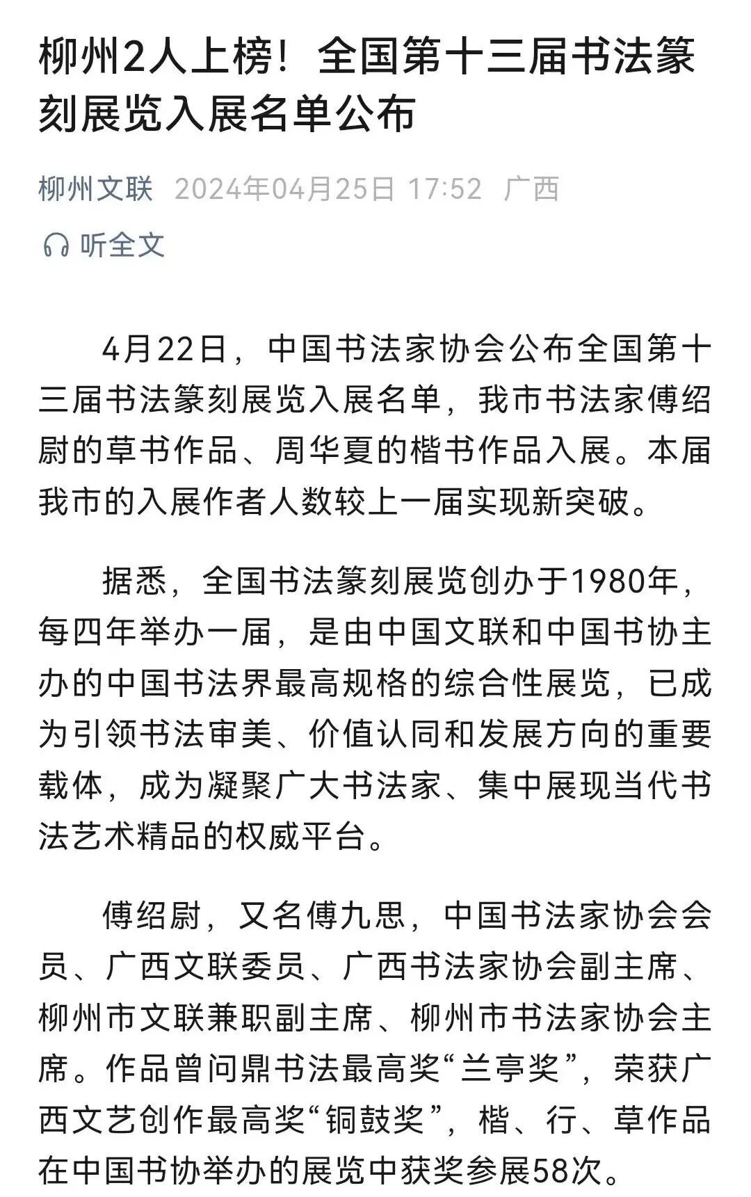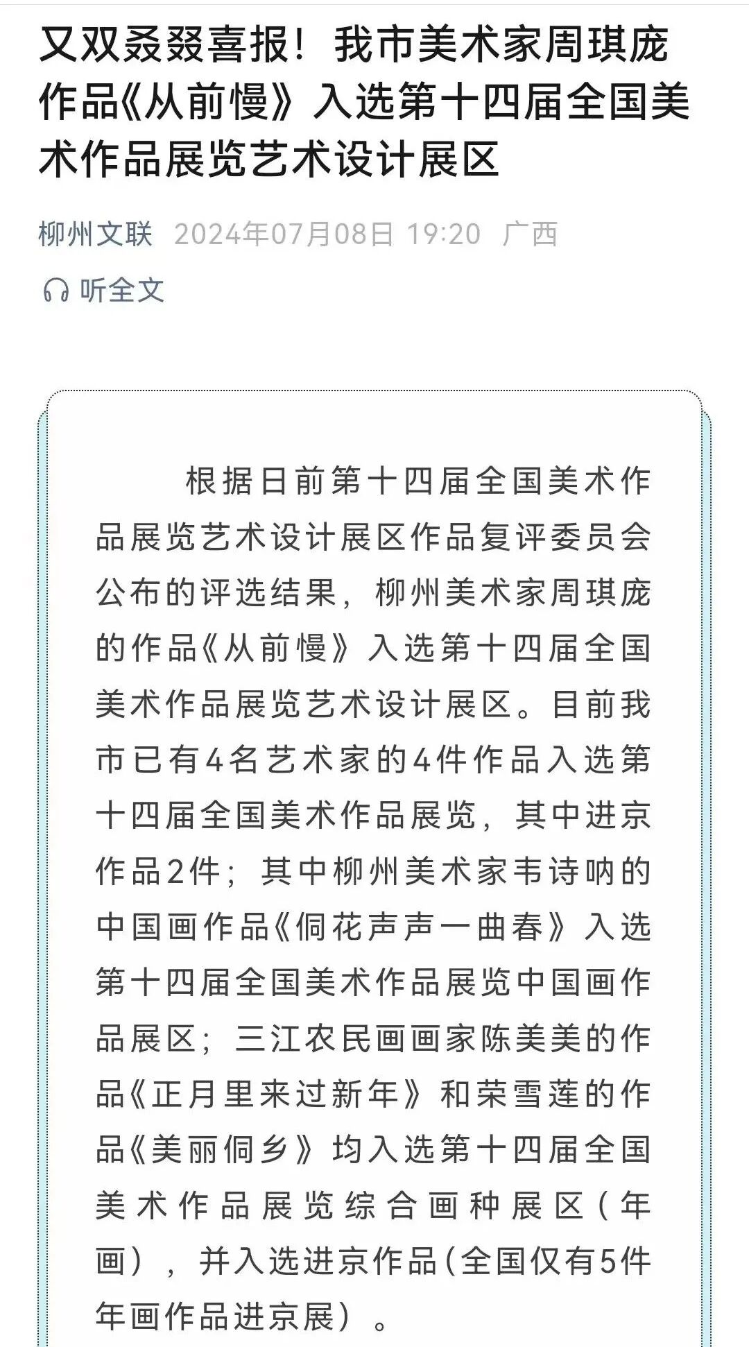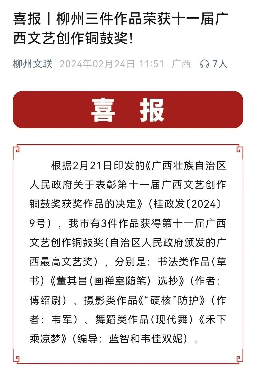 全市文联和市文艺工作者主动服务中心大局,用心用情用功创作,成绩显著。据统计,今年来我市有近350件文艺作品获省级以上文艺奖项(展览、赛事),40件文艺作品获国家级文艺奖项(展览、赛事)。其中2件书法作品入选全国第十三届书法篆刻展览进京作品展,实现新突破;4件美术作品入选第十四届全国美术作品展览,其中2件年画作品入选进京作品展(全国仅5件),创历史最好成绩。3件文艺作品获第十一届广西文艺创作铜鼓奖;在2024年广西艺术作品展览中柳州市文艺作品获奖、入展作品数量持续名列各设区市前茅。市美术家欧顺红主席3幅美术作品获中国东盟中心收藏。我市文学创作主要经验获广西作协党组书记程小华肯定性批示。