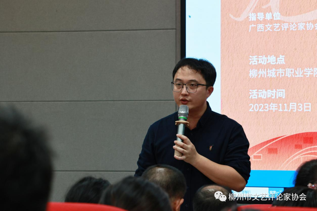 广西文艺评论家协会副主席、《南方文坛》副主编曾攀向学员介绍了文艺评论的新趋势,阐述海洋文学、新南方文学的动向,指出文学创作要打破壁垒,打通文体,作品要反映现实更要反思现实。他还对杨仕芳、徐小雅、刘月潮、罗海、廖献红等柳州作家的作品进行点评。他指出柳州的工业呼唤具有创新意义的报告文学,散文创作在向经典致敬时也应生出自己独特的意蕴,而小说创作既要做好“叙事”又要做好“叙世”,关注灵魂的周旋,关注命运的挣扎,使作品的艺术和内容与现实和读者真正实现交流和联系,正是文学所要解决的,也是文艺评论要聚焦的话题。